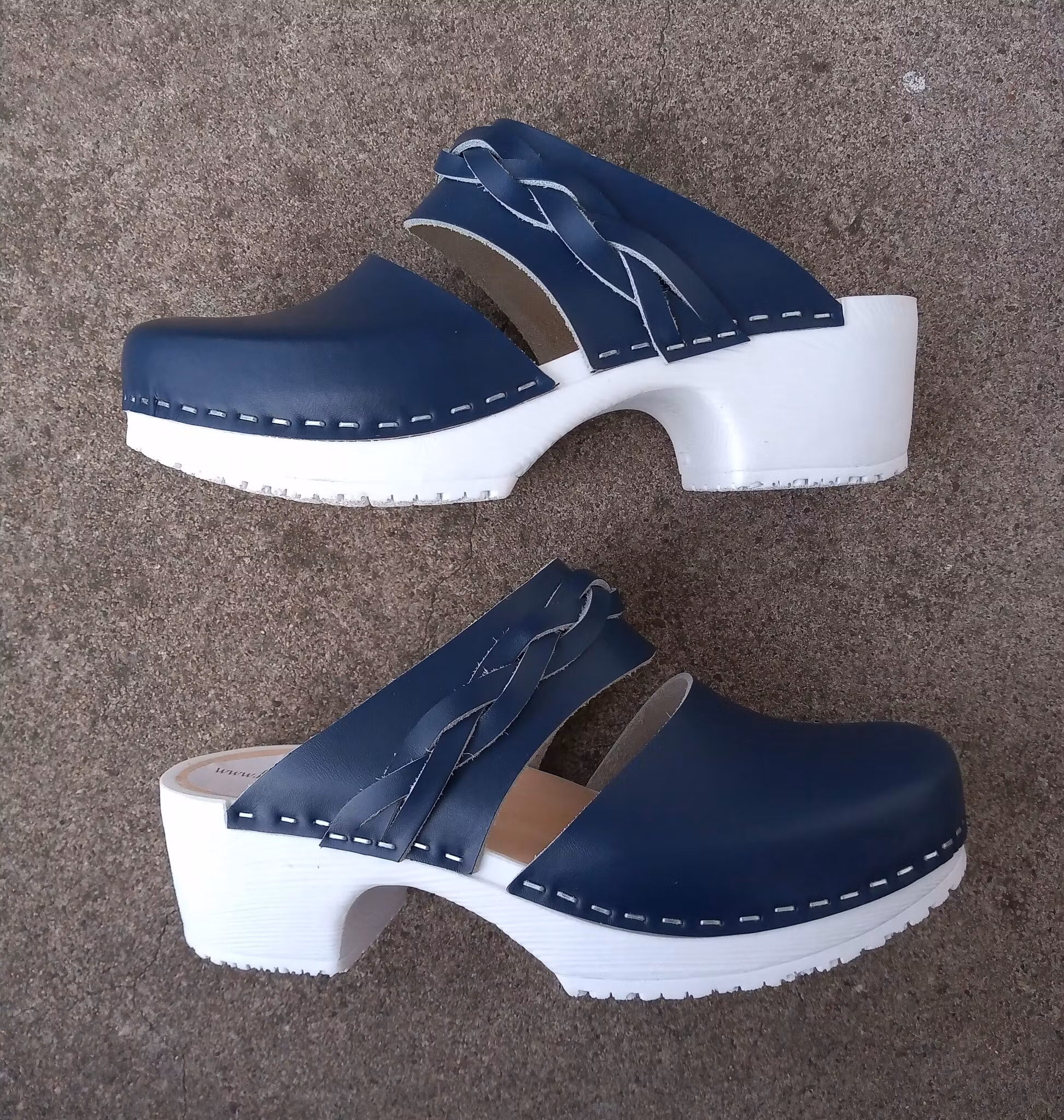 Mjuk och skön mjuktoffel med fanérinlägg närmast foten , marinblått läder, samt flätad vristrem.