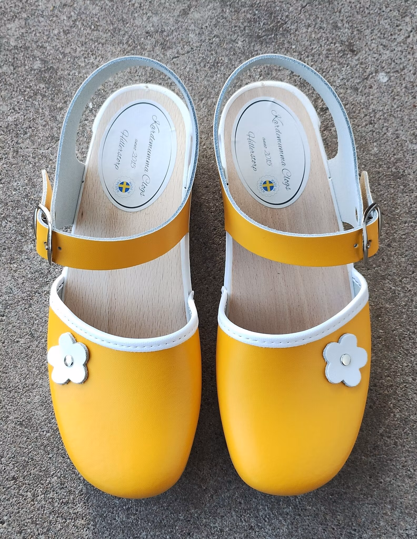 Cornelia, vit mjuk botten, gult läder, samt blomma
